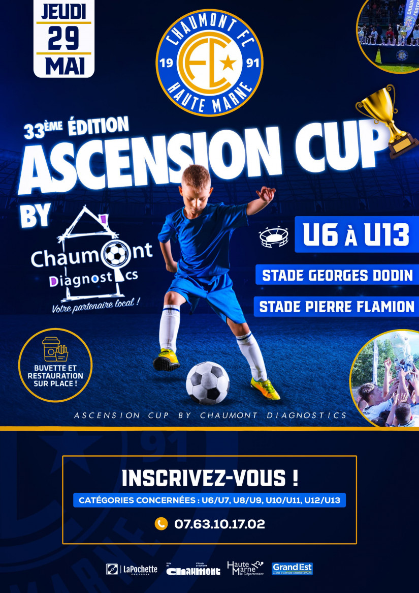 Tournoi Ascencion Cup Chaumont Football Club Publié le mercredi 29 janvier 2025 à 11h54 · Événements Lieux : Stade Georges Dodin et Pierre Flamion Date l'événement : Jeudi 29 Mai 2025 à 09h00 Date de fin de l'événement : Jeudi 29 Mai 2025 à 18h00